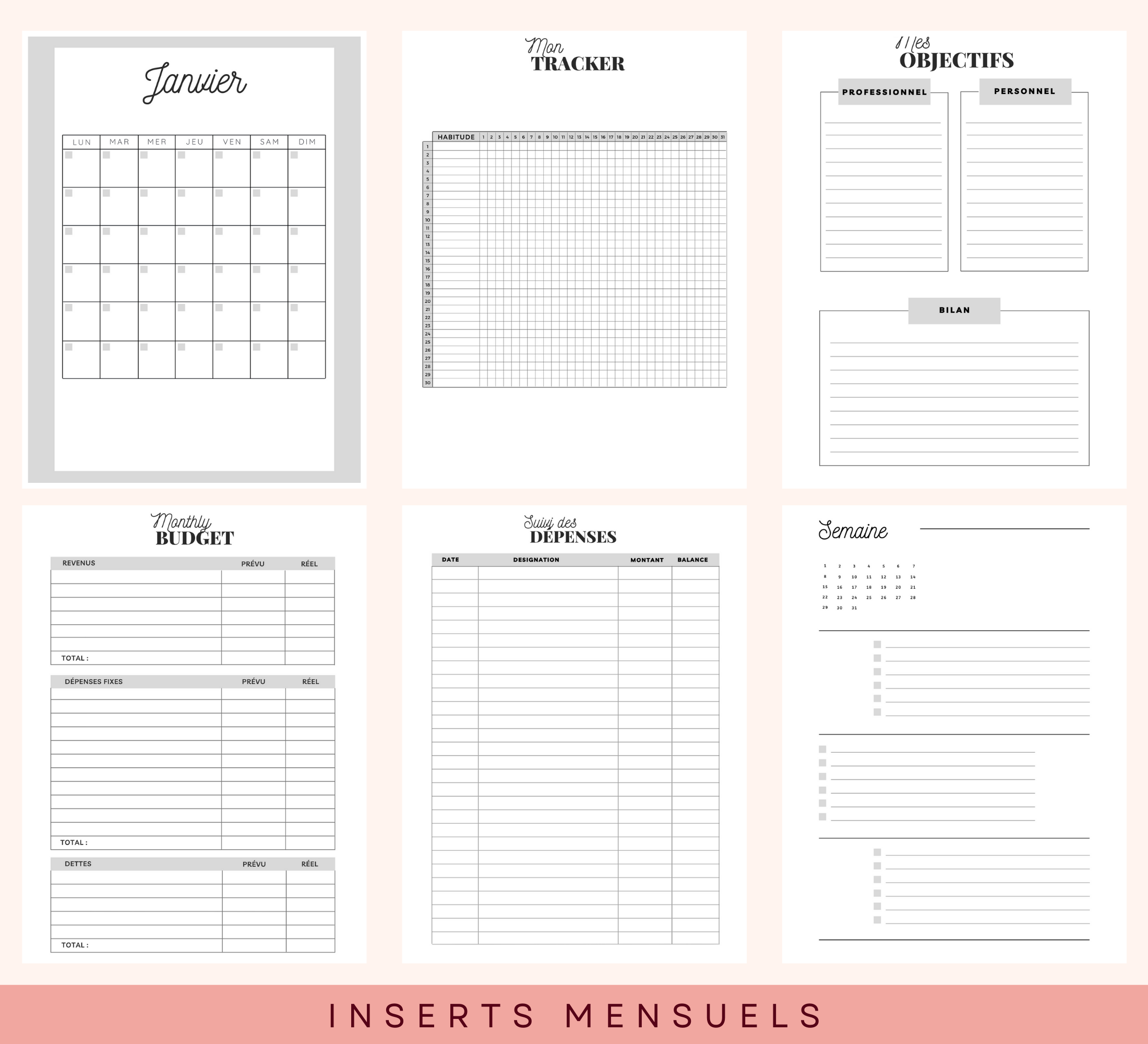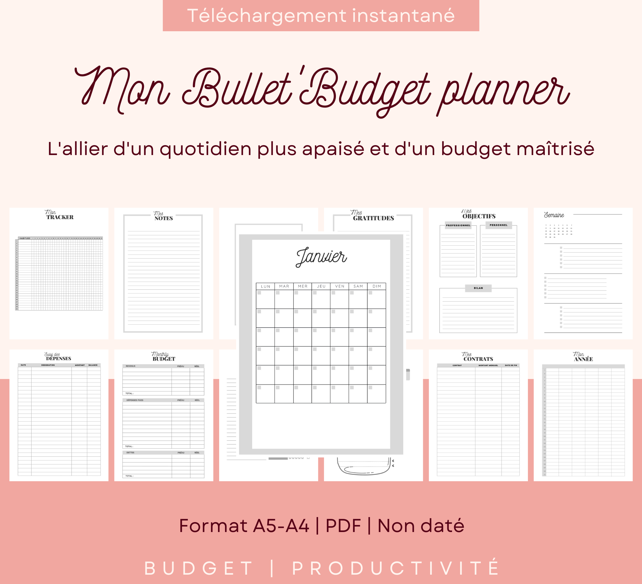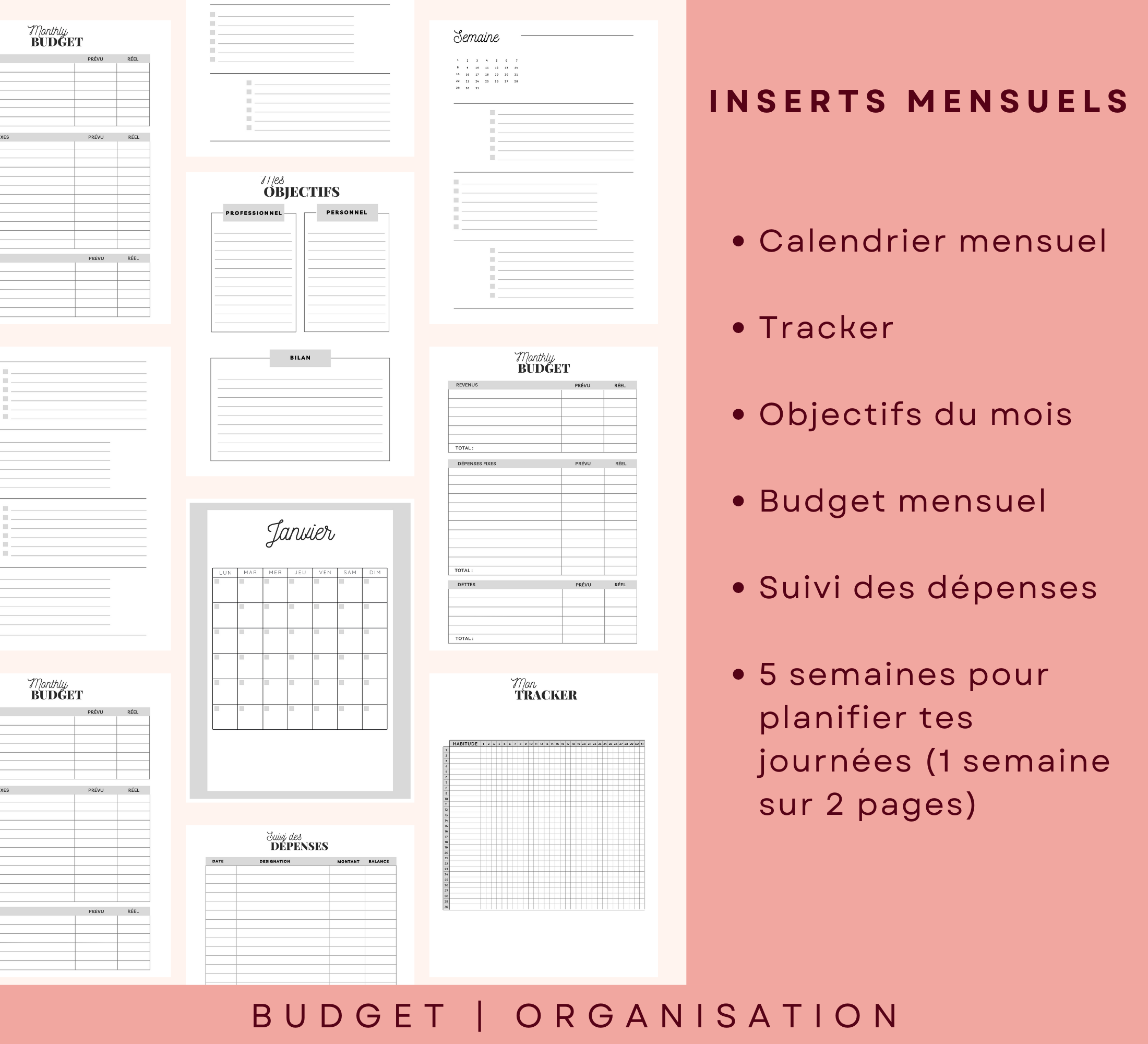 Chaque mois, un tracker pour suivre tes habitudes, établir et suivre ton budget + 5 semaines (1 semaine sur 2 pages) pour tes to-do-lists quotidiennes.