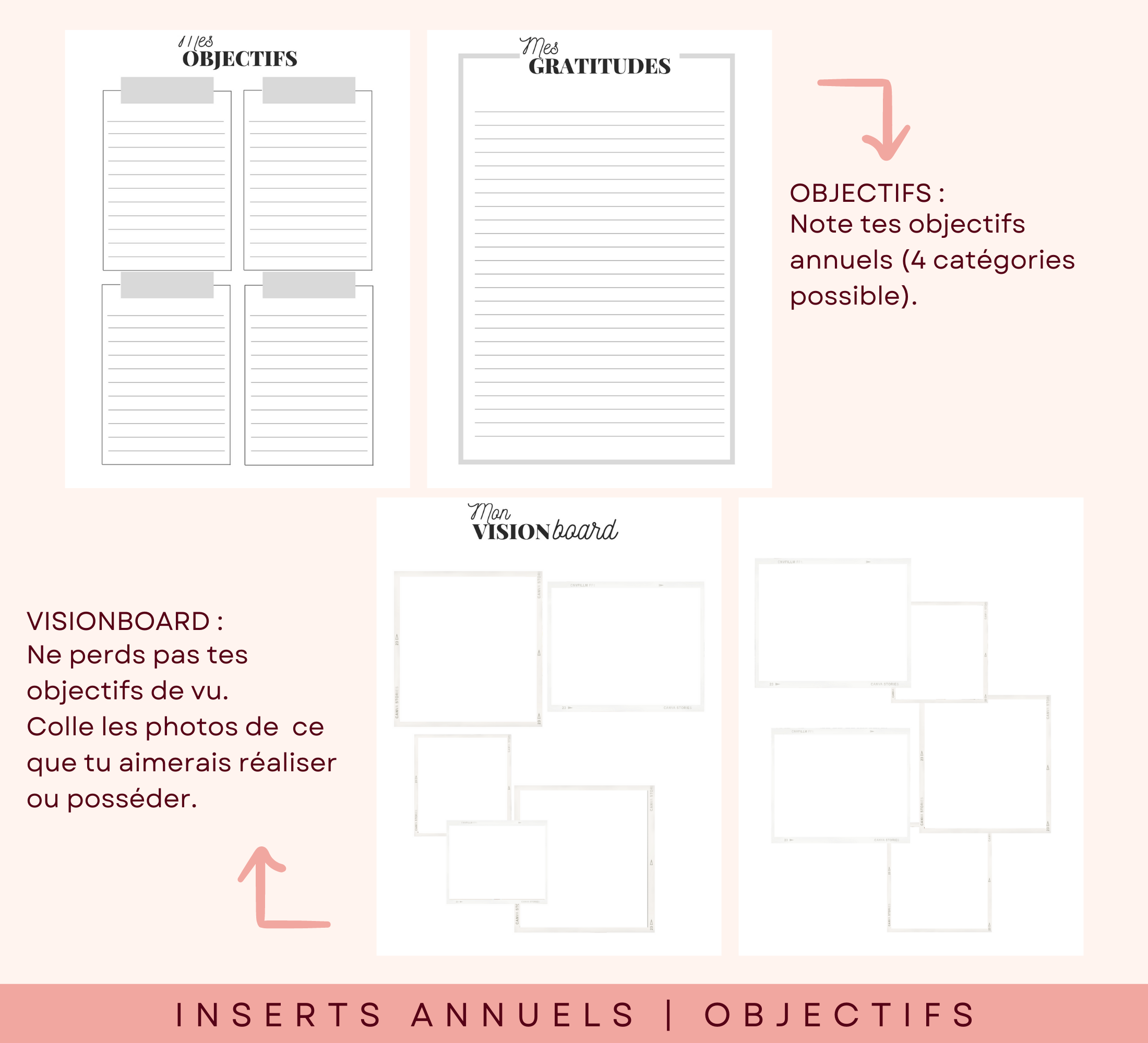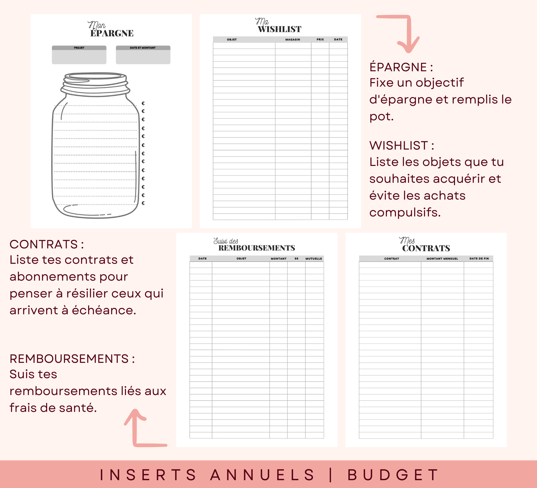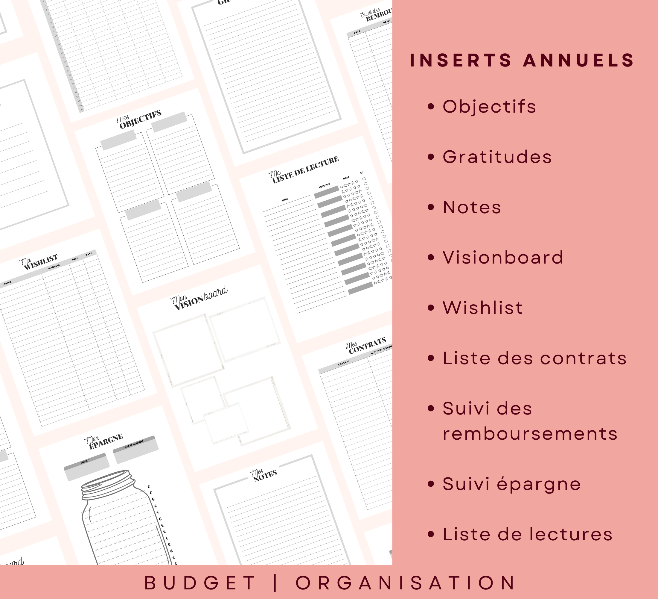 Des inserts annuels pour t'aider à définir tes objectifs, maîtriser ton budget, suivre ton épargne.